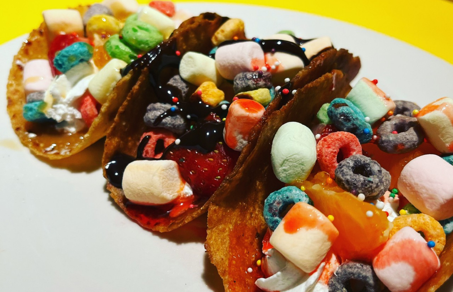 ホイップ・季節のフルーツ・シリアル・マシュマロをのせたアメリカンポップ!なデザートタコスです。